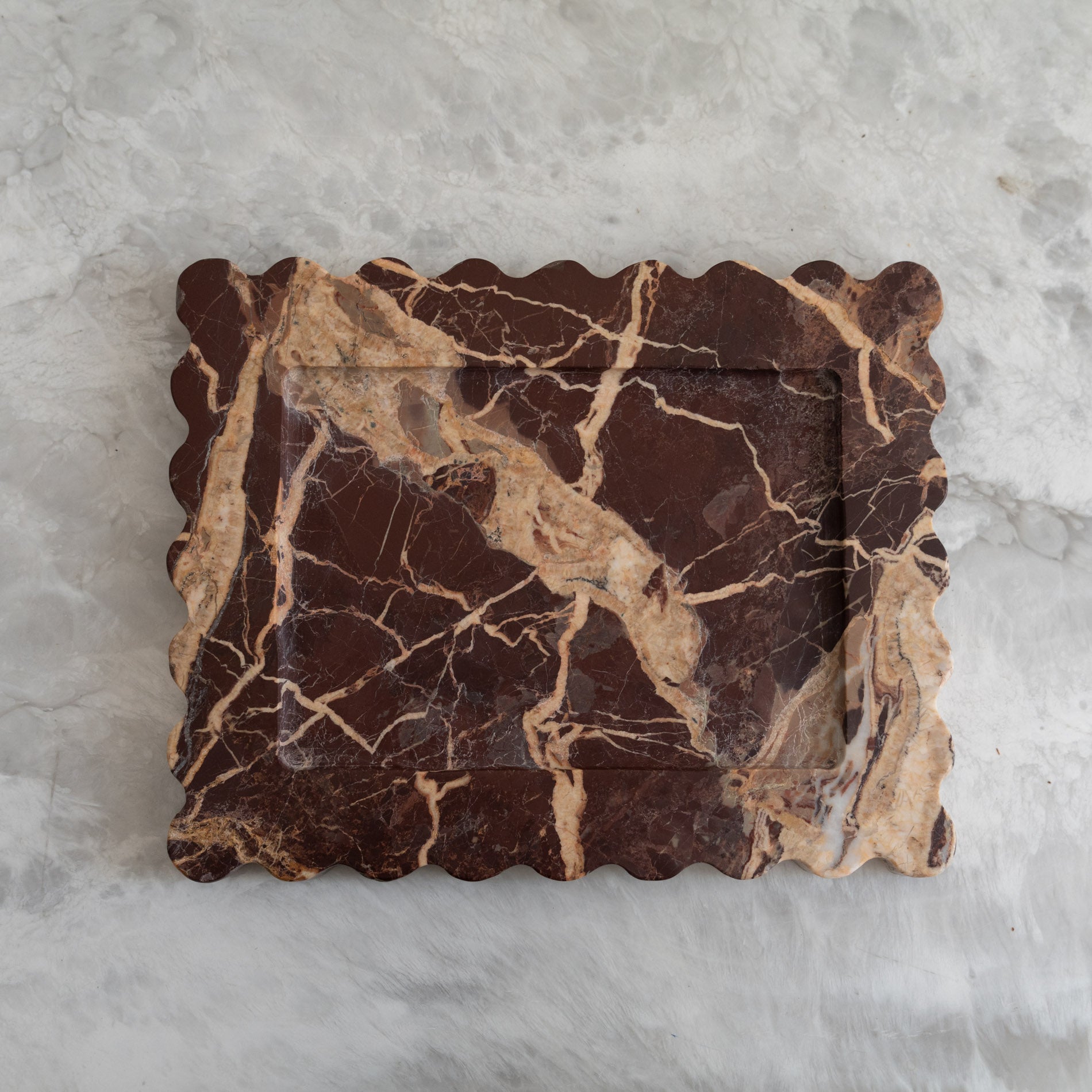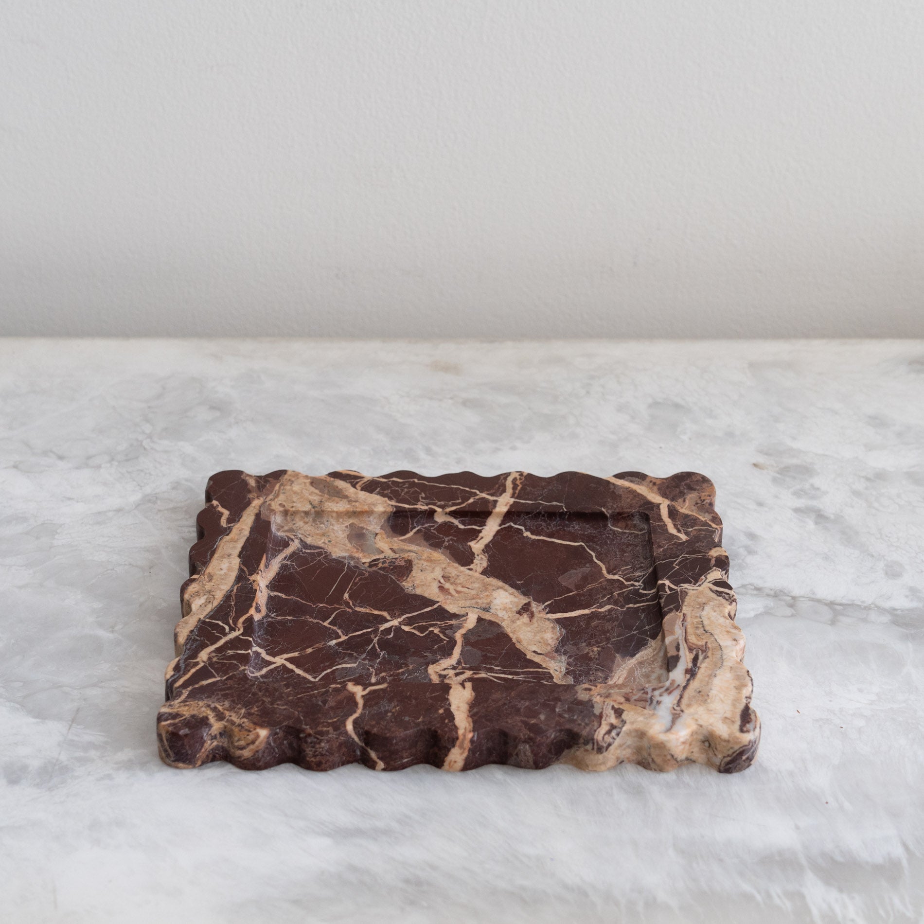 A functional object d'art. The 810 is a sculptural eight by ten inch tray cut from a single piece of solid marble or stone with scalloped edges, hand-finished by artisans in a growing stone atelier in Rajasthan, India.
