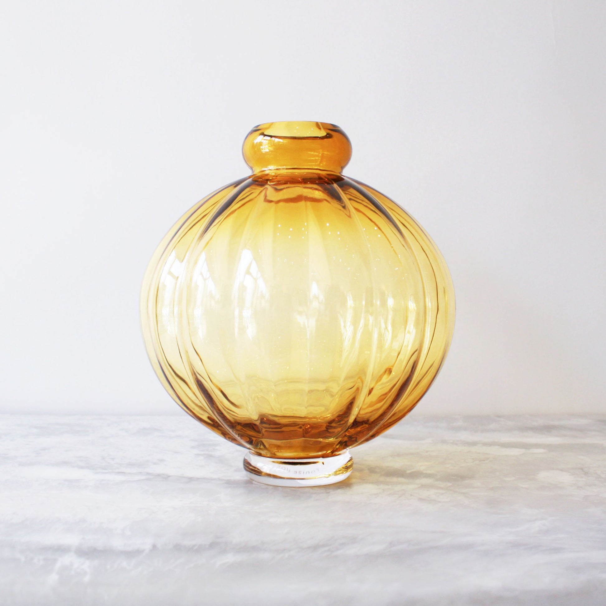 The Round Balloon Vase is made in mouth blown glass in Poland, which gives its characteristic round shape and playful curves. It is a small sculpture and works perfectly without or with just a few flowers in.