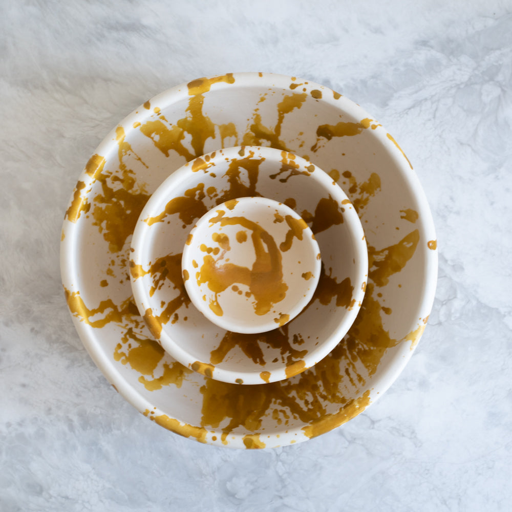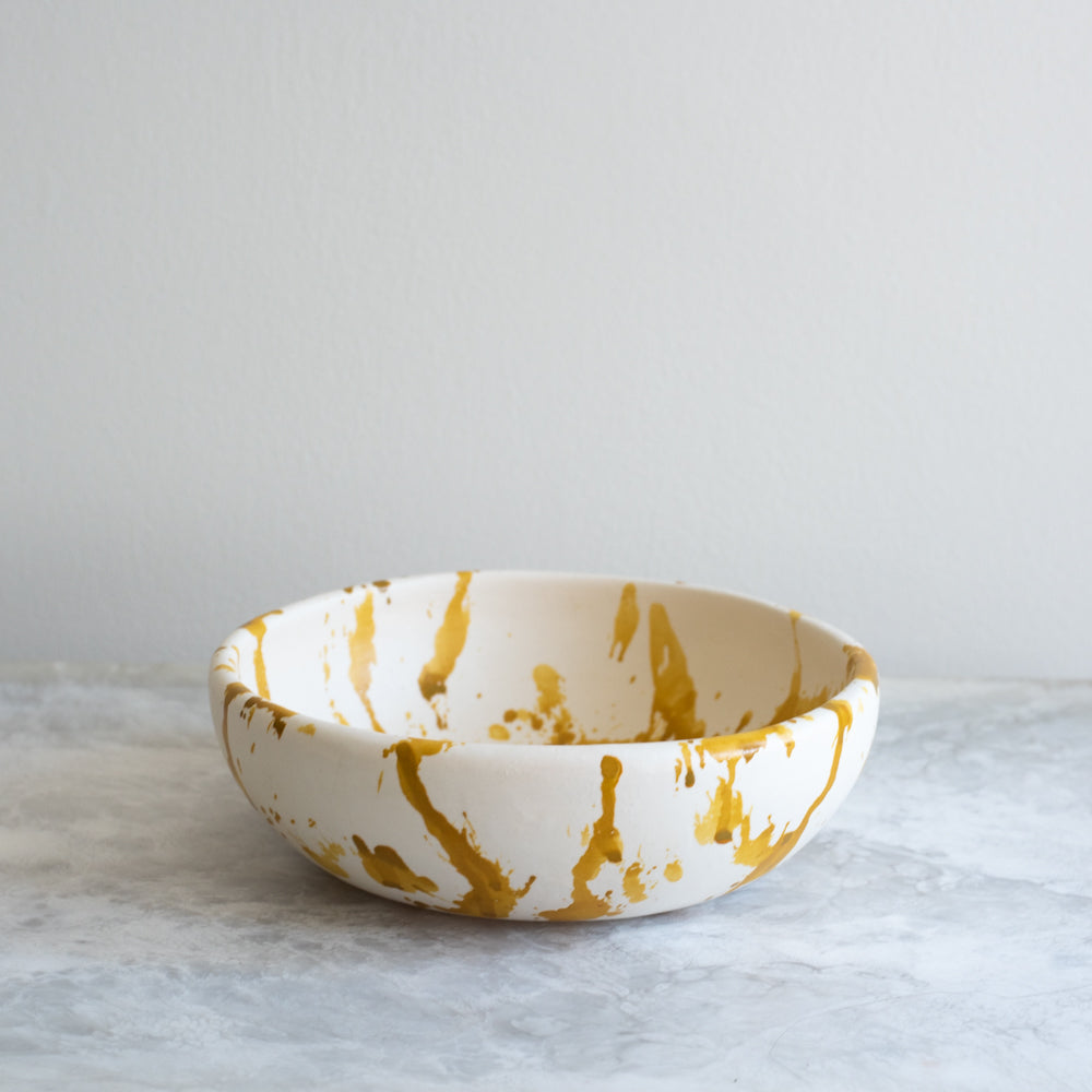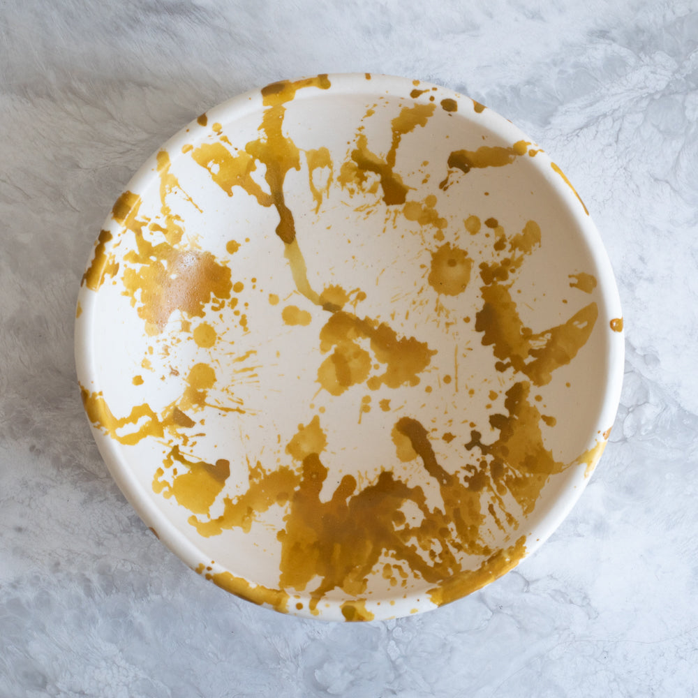 Each piece is entirely made by hand and glazed in a matte glaze with hand painted splatters that resemble Pollock's artistic work. Due to the handcrafted nature, no two are the same, and hand washing is recommended.