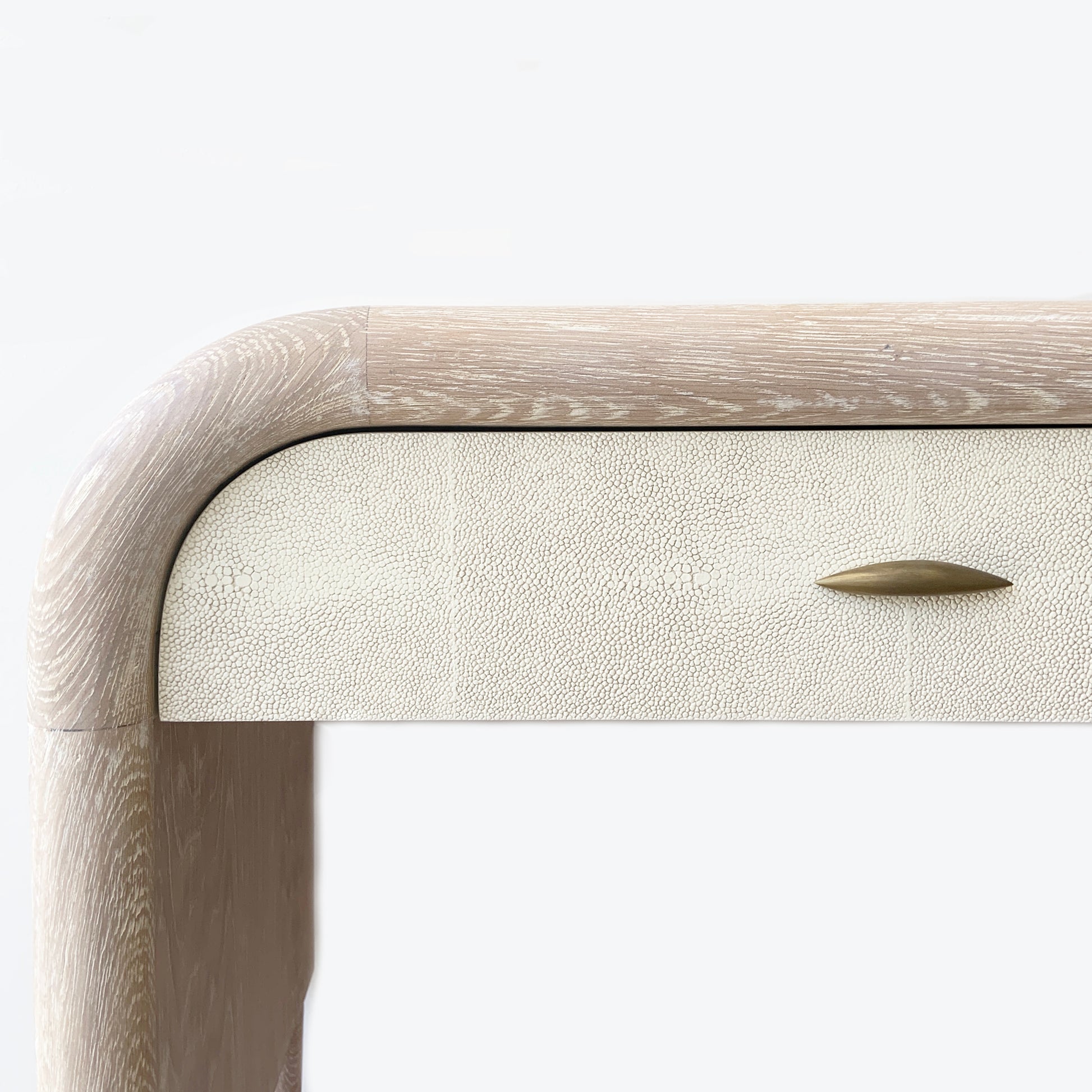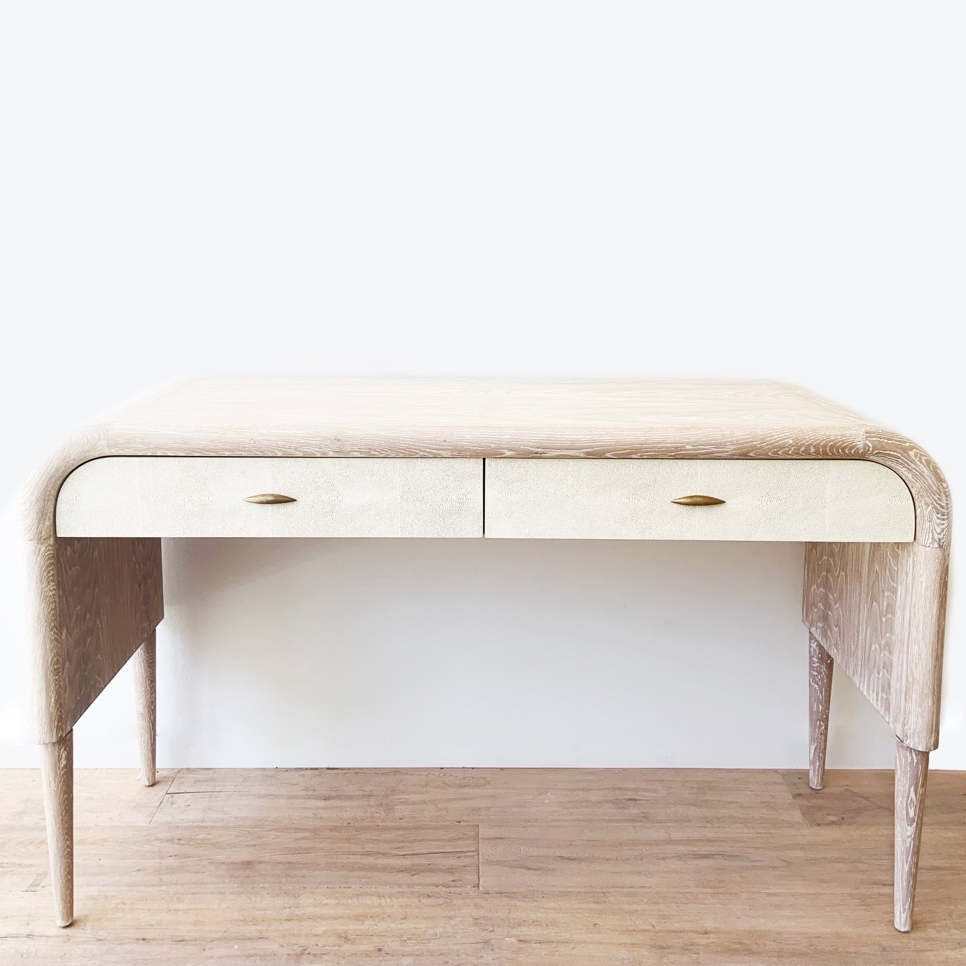 The rounded frame takes its cue from the late '60s, with Whitewashed oak and vintage faux shagreen drawer panels making it a contemporary beauty. The shape highlights the wood's gorgeous grain and tapered legs provide a shapely finish.