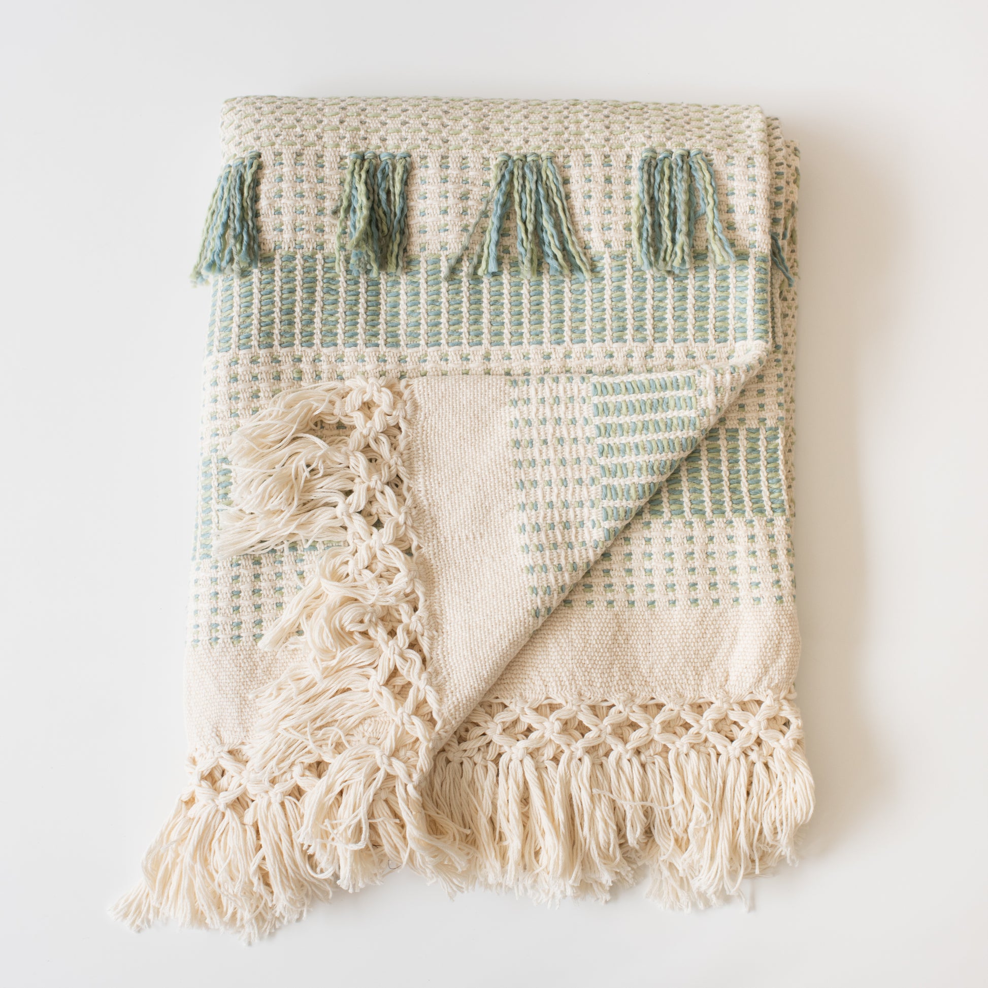 The Feijoa fruit inspired to create an all mint green throw showcasing dusty green and seaglass hues with playful tassels on both ends. Ideal for a single bed cover or as a large bed throw for queen and king beds, the Feijoa is the new version of the bestselling classic Charala throw from the Roots Collection. Featuring elegant and intricate macrame knot ends and a soft blue and green color combination, the Feijoa is a nice addition to any living space.