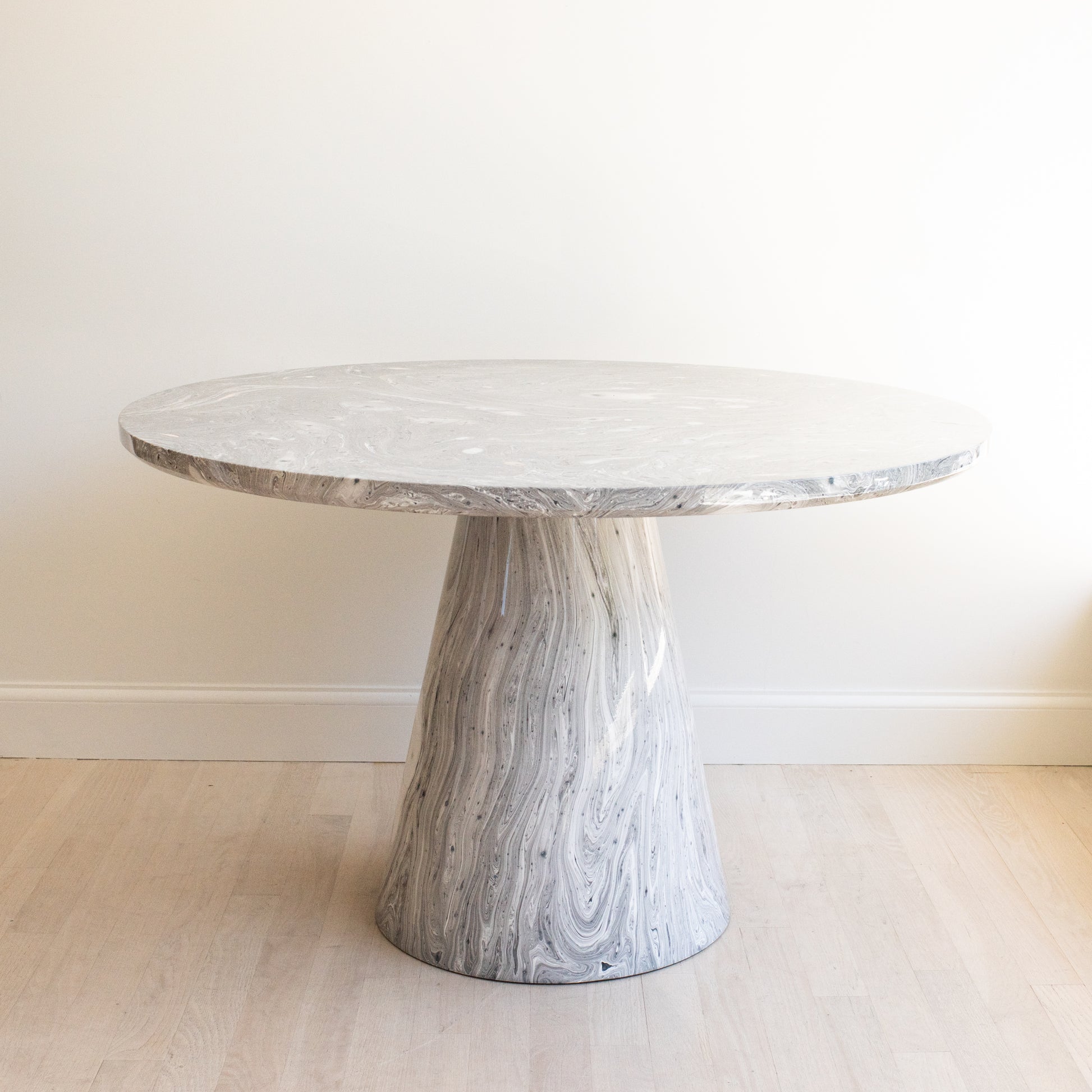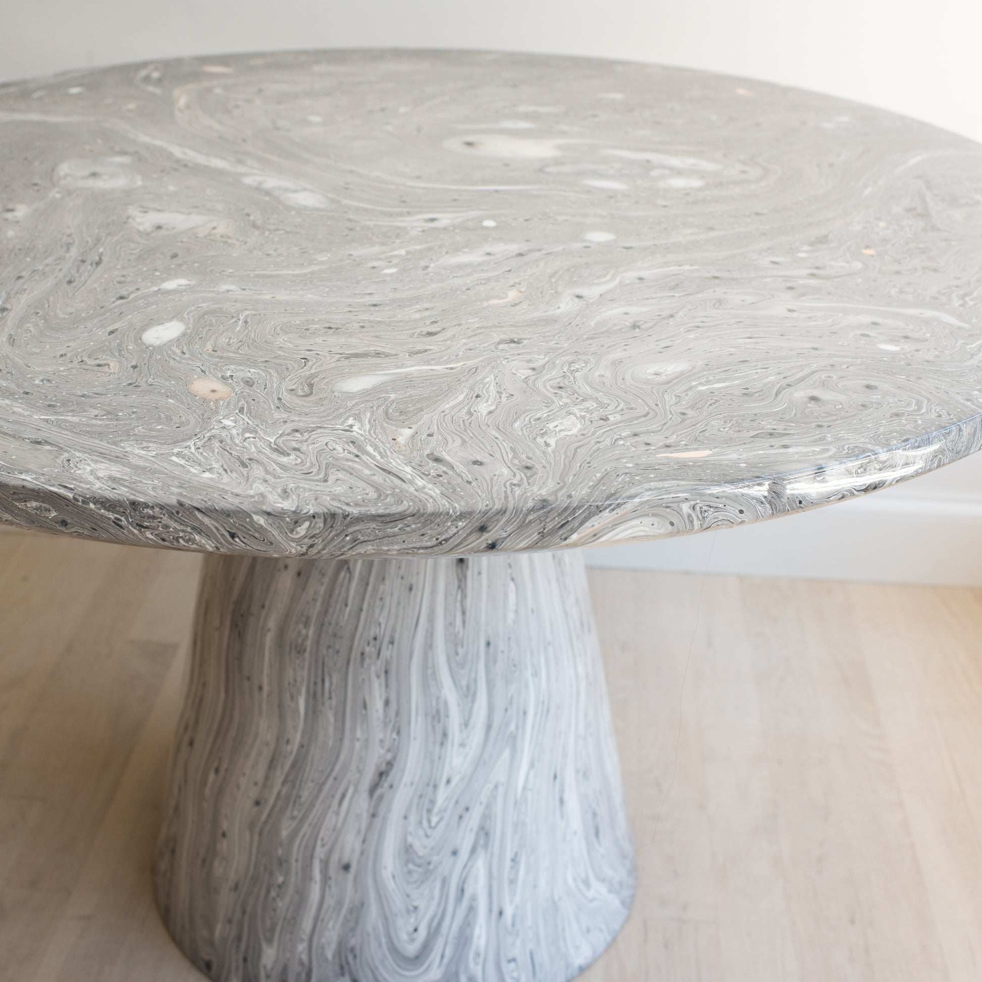 Lacquered resin is hand-painted using a graceful swirling motion to create the marbleized pattern that covers the surface of this entry table. Variation to be expected.