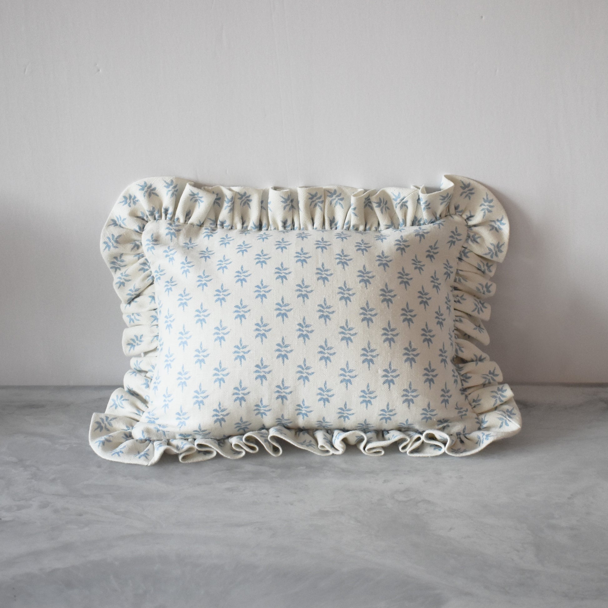 Laurel Leaf Pillow with Ruffle in Blue & Oyster