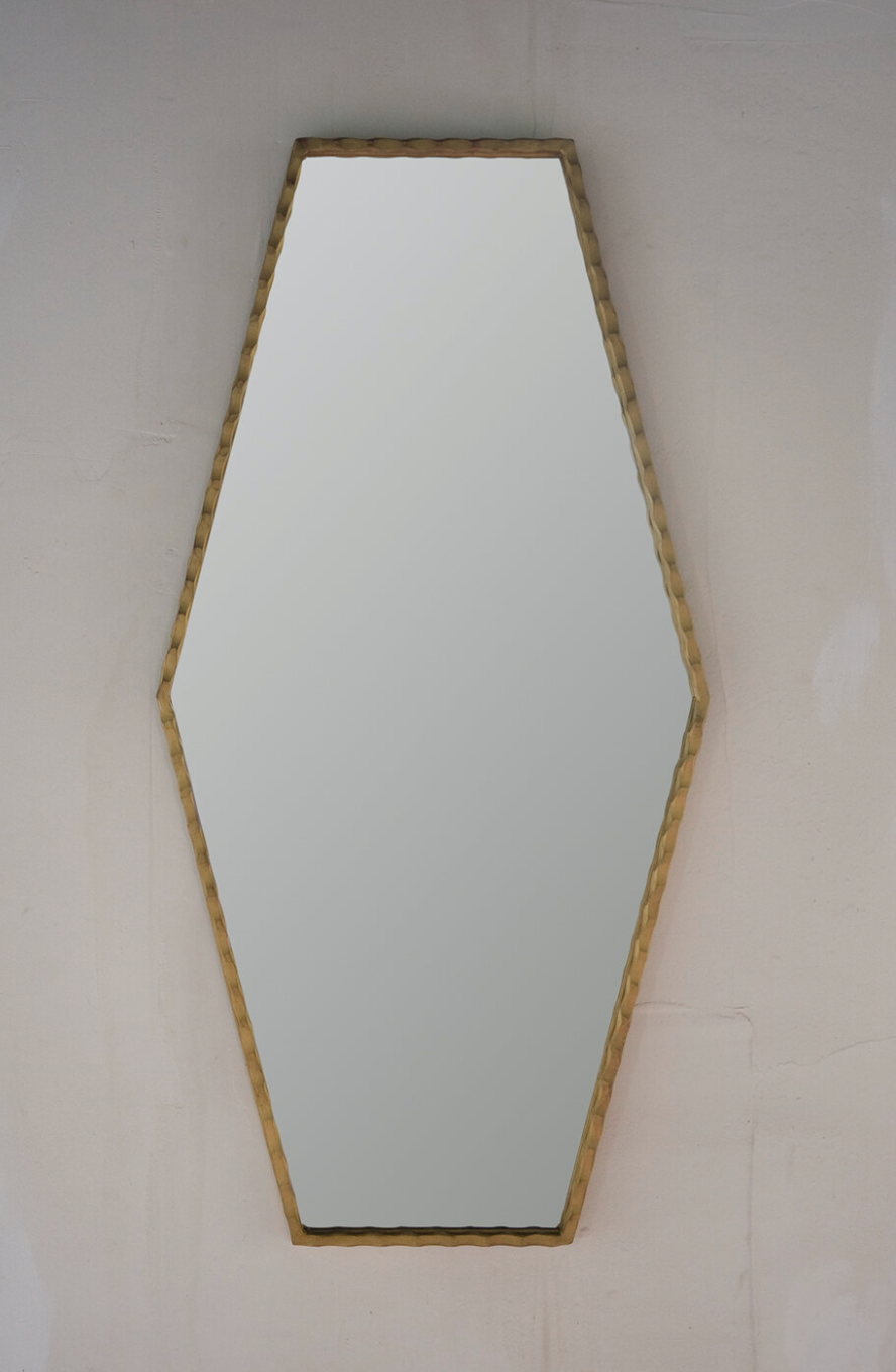 Marguerite Mirror from the Nouveau Collection. Hand-painted hammered steel frame in an elongated hexagonal shape. Shown in a gold finish.