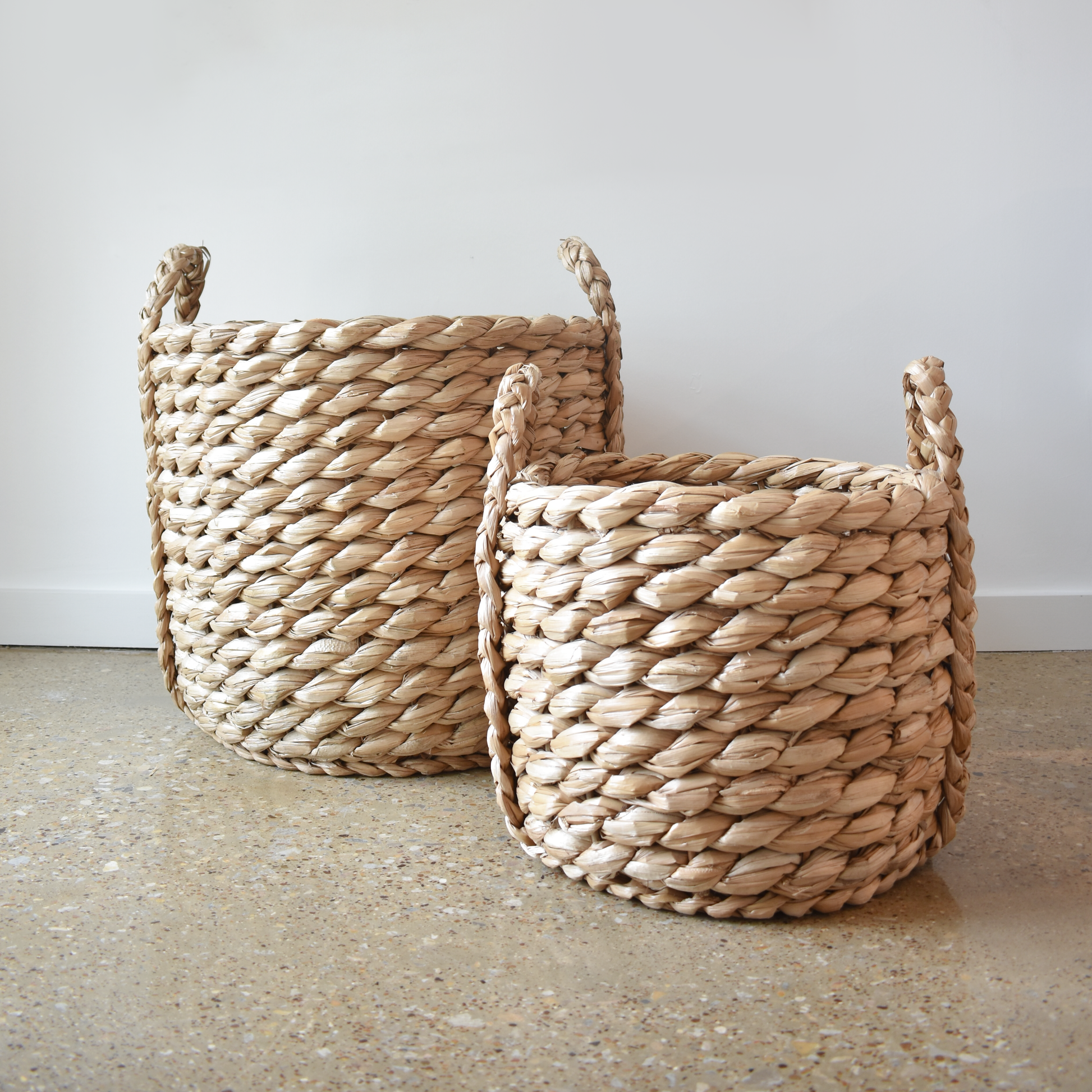 Woven seagrass makes up our simple and sturdy basket. Braided handles contrast nicely with the rope-like style - use them for holding towels, toys, or anything else that requires casual storage.