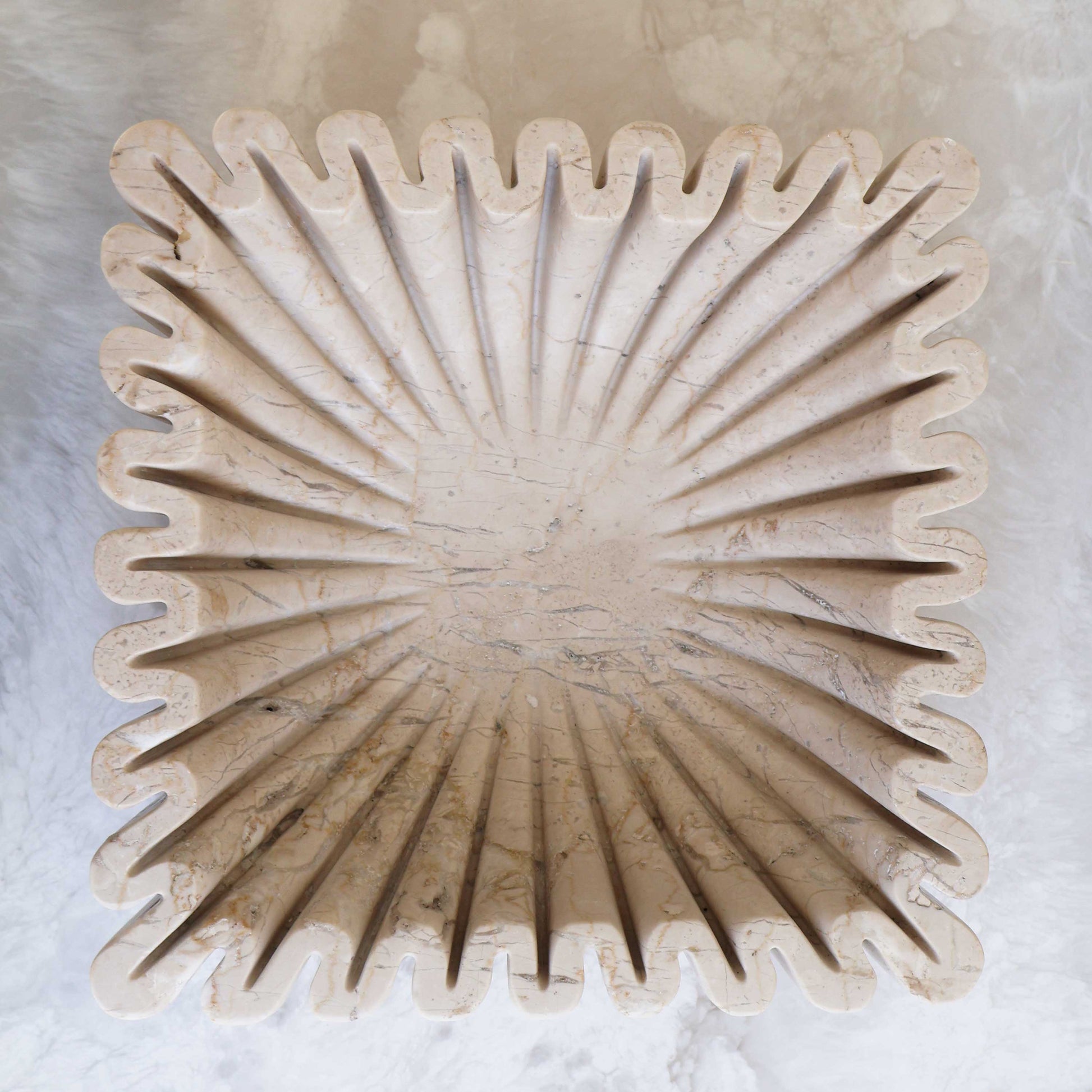The Square Ruffle Bowl is a heavy set, nine-inch square bowl cut from a single piece of solid stone, hand-finished in a twisted rope motif by artisans in a growing stone atelier in Rajasthan, India.