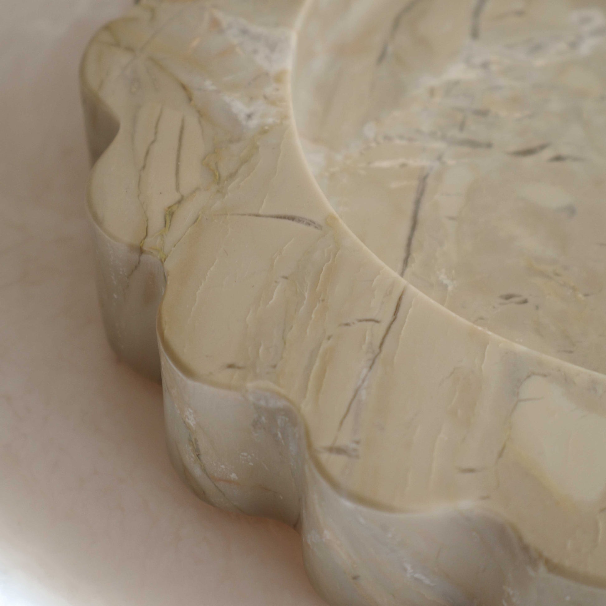 The Sun is a sculptural eight inch round tray cut from a single piece of solid marble or stone with scalloped edges, hand-finished by artisans in a growing stone atelier in Rajasthan, India.