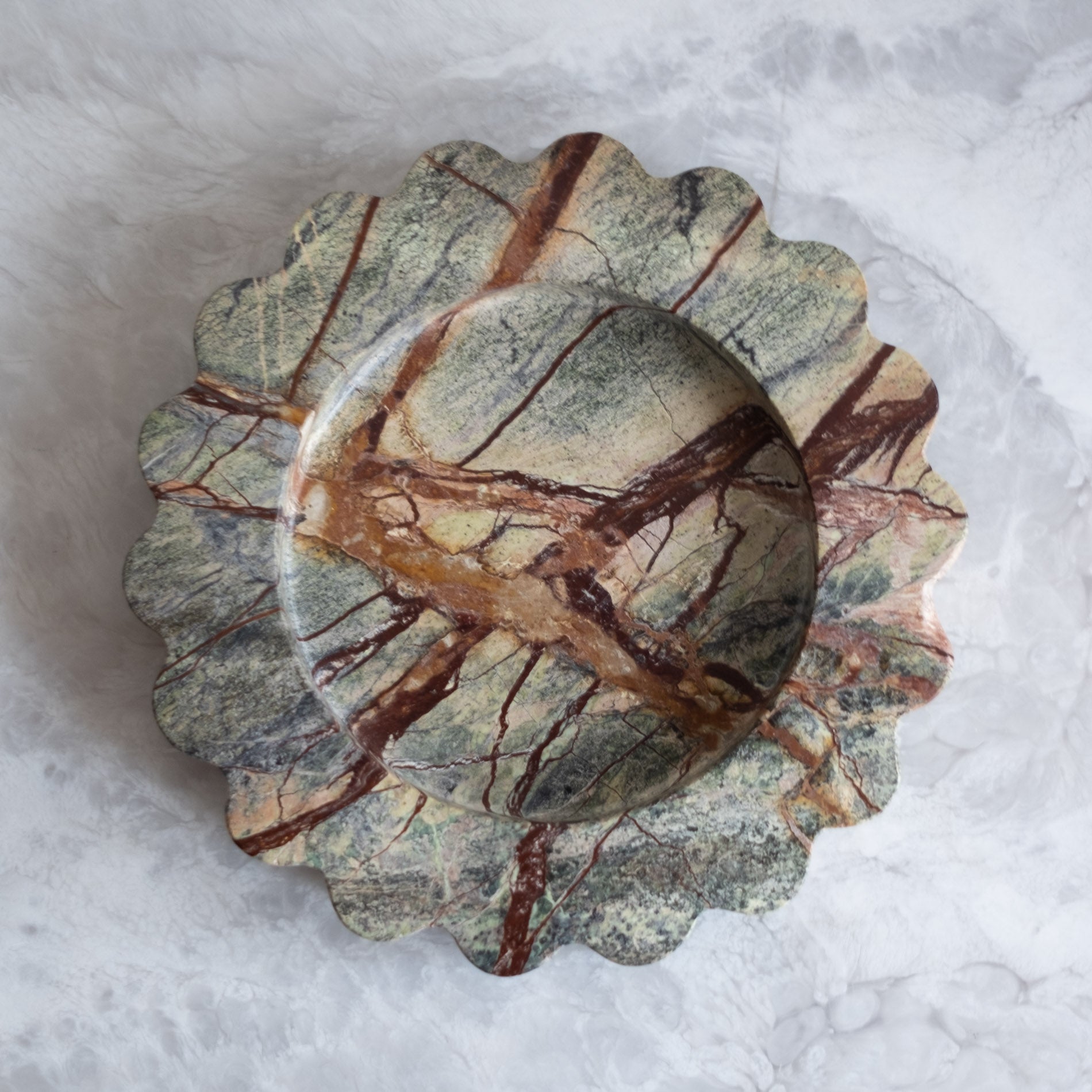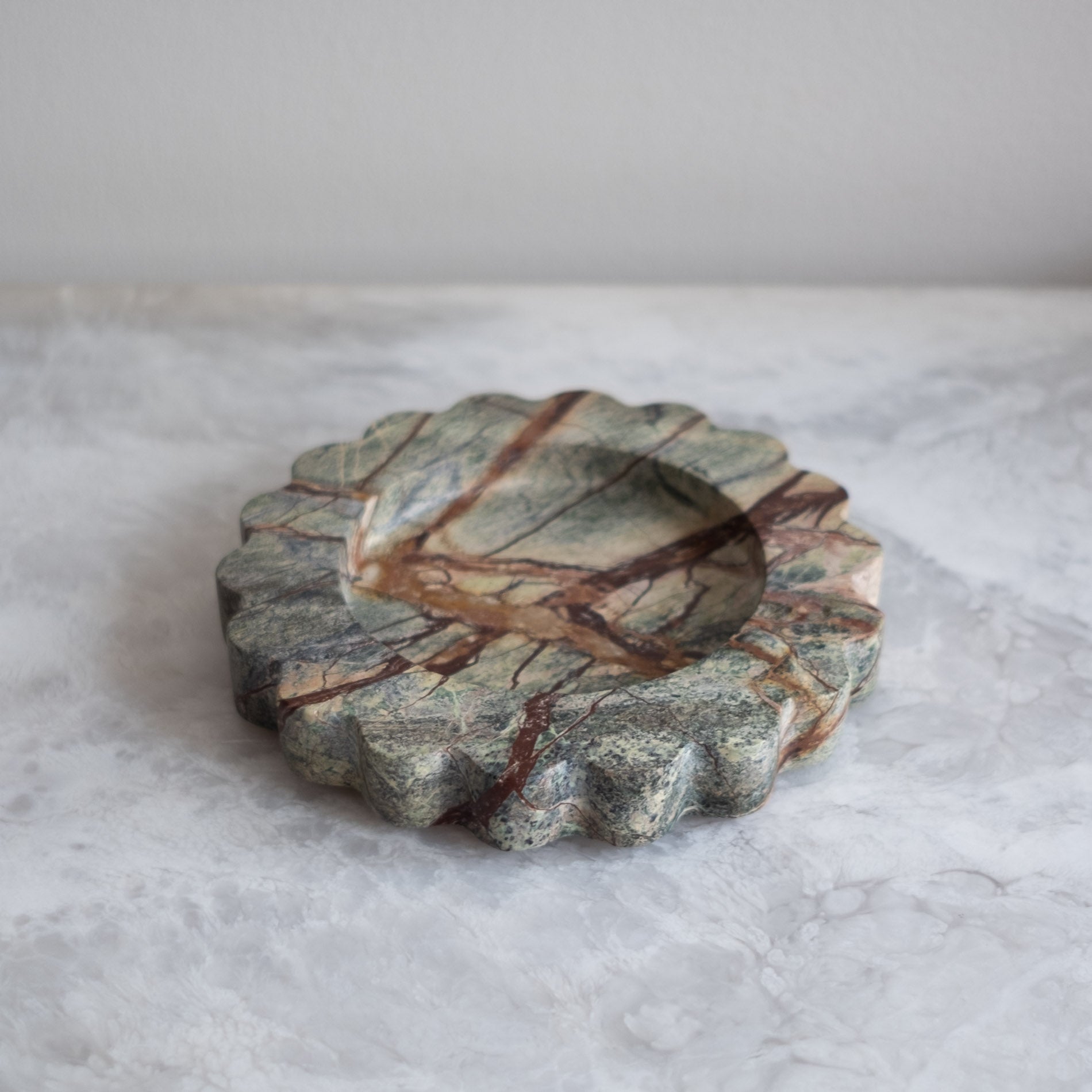 The Sun is a sculptural eight inch round tray cut from a single piece of solid marble or stone with scalloped edges, hand-finished by artisans in a growing stone atelier in Rajasthan, India.