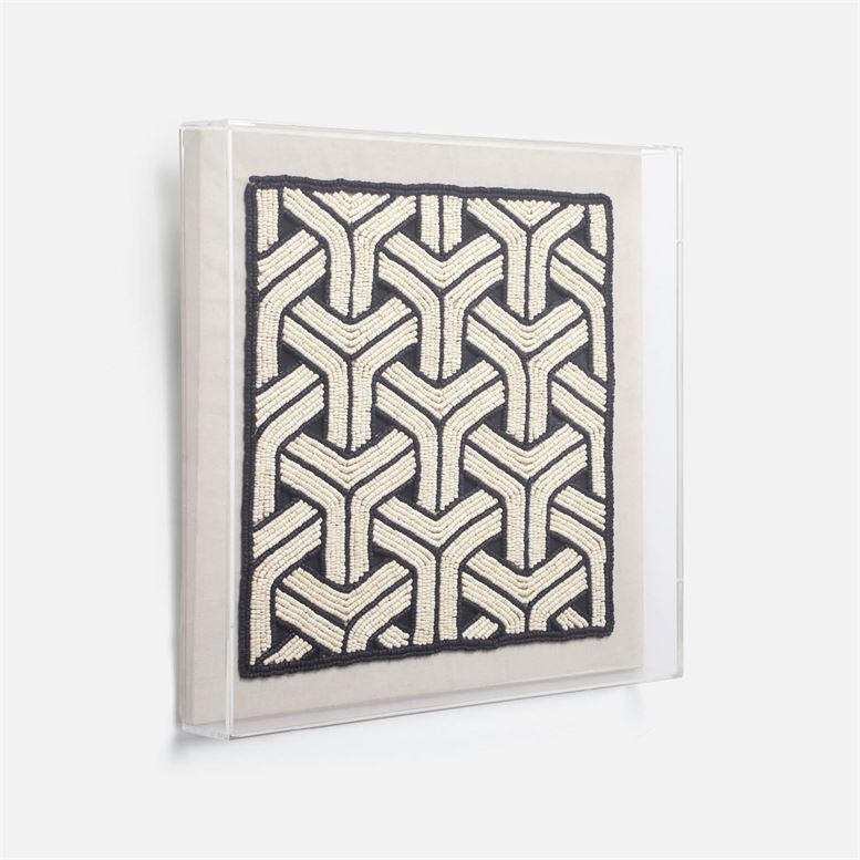 Natural materials meet pop art sensibilities with our graphic Zema. Coco beads are hand woven to create the bold black-and-white pattern, encased in an acrylic frame for easy display.