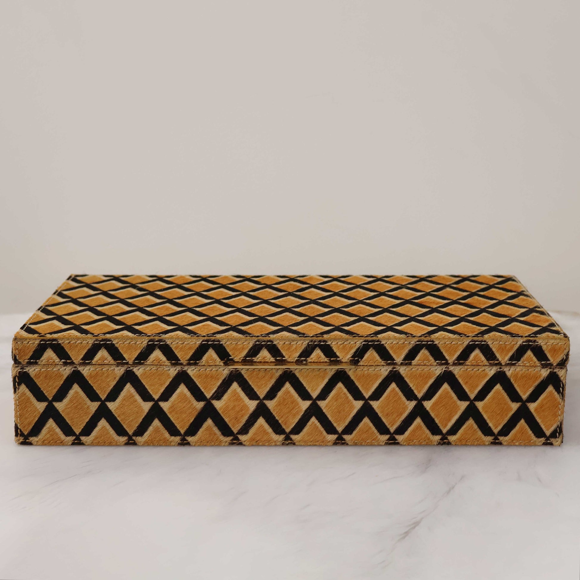 Our Zion box set puts a design-forward spin on luxurious hair-on-hide. The set's timeless diamond pattern is achieved with a two-step screen-printing technique.